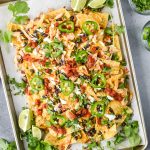 Usually if it’s just the two of us, I’ll make a half batch of these nachos with whatever stuff we have left in the fridge. Nachos definitely function as a fridge clean out, if we have tortilla chips on hand. Sometimes I use refried beans mixed with diced green chilies if I’m feeling extra. My point is that nachos are super versatile and you should make them just how you like them