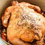 - Prep the outside of the chicken: Using your fingers or a pastry brush, coat the outside of the chicken with melted ghee, brushing the top and around all sides of the chicken (except the bottom – no need to move the chicken). Season the outside of the chicken liberally with salt and pepper (about 1/2 teaspoon each salt/pepper).